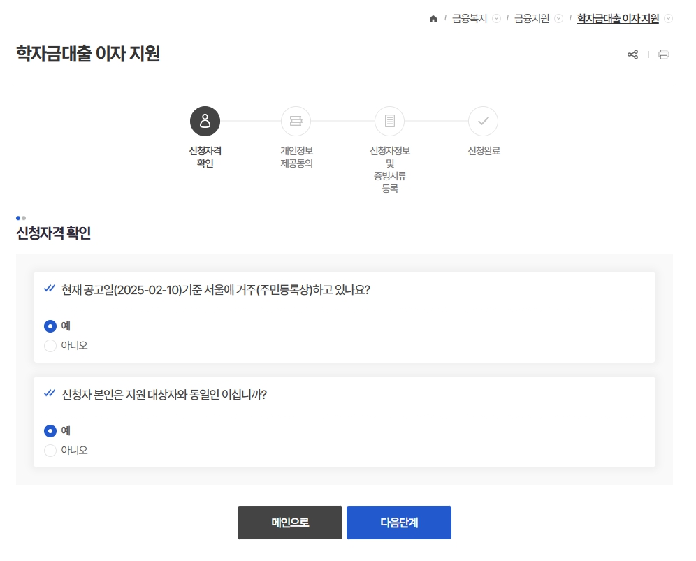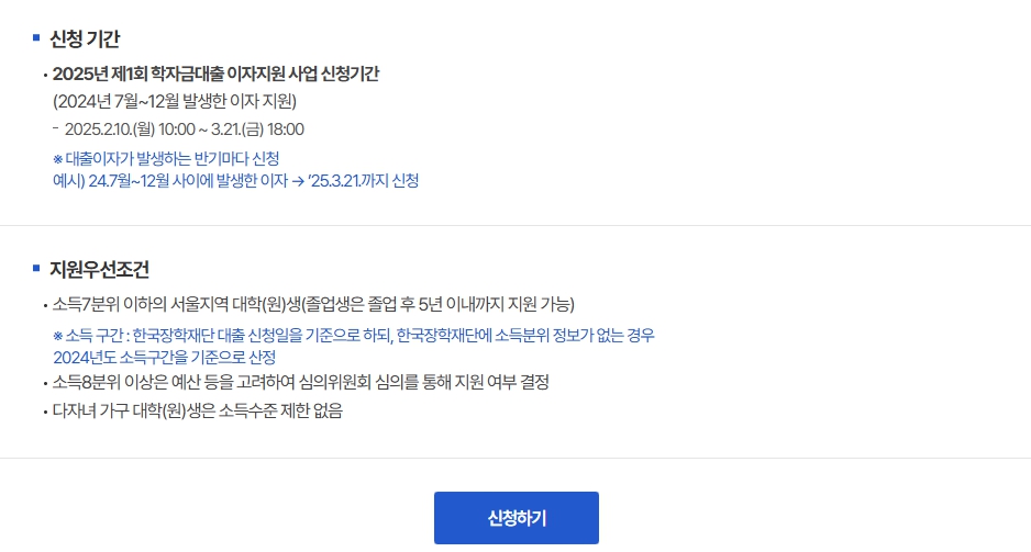 이번에는 2024년 7~12월 분 이자에 대해 2025년 2월3일~3월14일 (금 18:00)까지 신청을 받으니, 기한 내 신청해야 하반기 이자를 지원받을 수 있습니다.